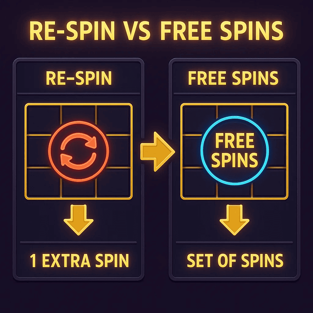 Re-spin on mehhanism, mis annab ühe lisakäigu ilma uue panuse tegemata, kuid tavaliselt on see ainult üks lisakäik, mitte täielik tasuta keerutuste voor. Poola slotide juhendid kirjeldavad re-spini kui „rullide korduskeerutust ilma panuse kuluta” ja märgivad selgesõnaliselt, et tegemist on üheainsa keerutusega, mis eristab seda tasuta keerutustest (mis antakse kindla arvu kaupa).